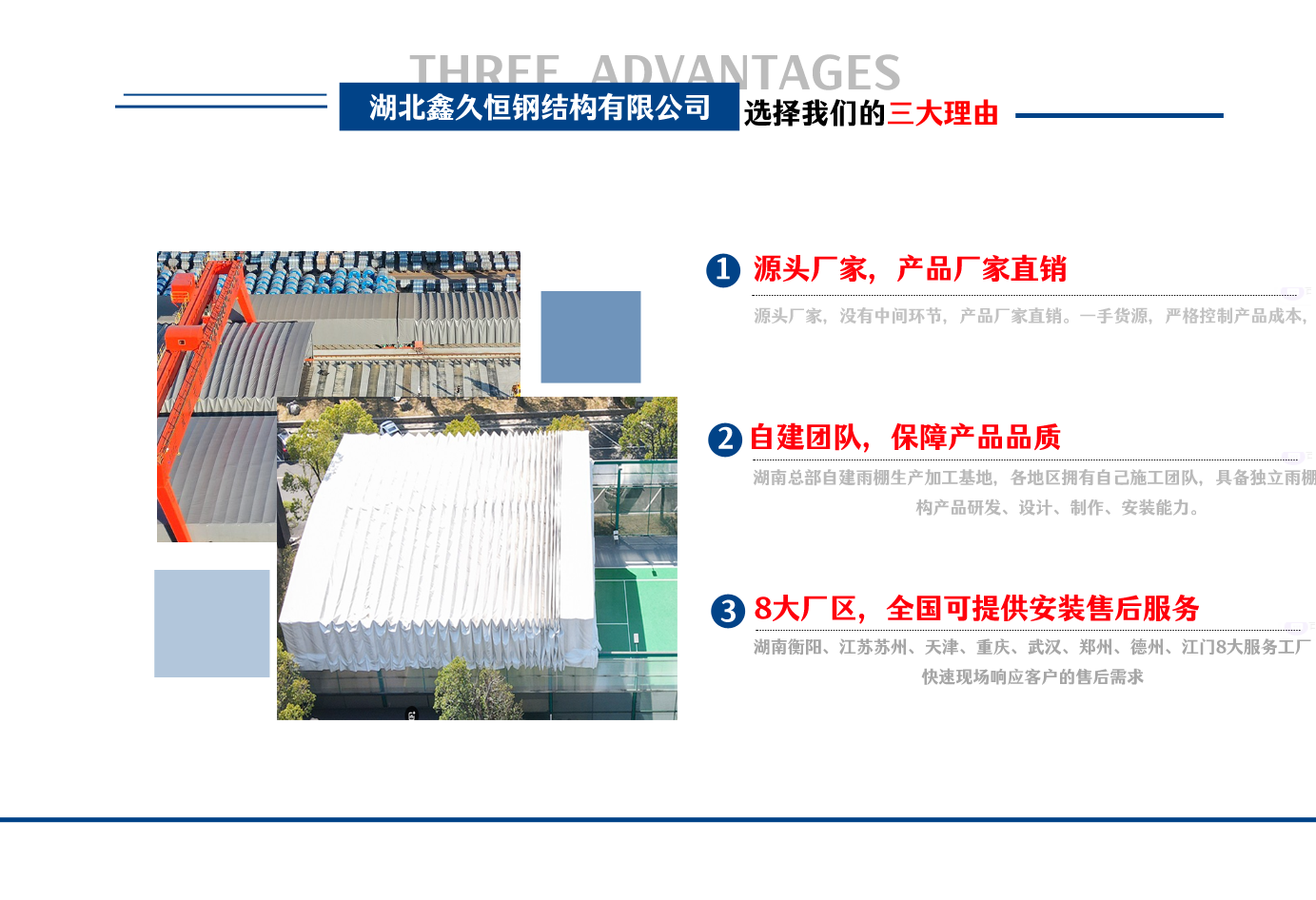 湖北鑫久恒鋼結構有限公司是一家電動雨棚、膜結構車棚研發,生產銷售,施工安裝于一體的專業鋼結構科技公司,主要產品有伸縮雨棚,電動雨棚,膜結構車棚等?! 『系貐^職員目前有80多人,占地面積20000平方米,廠房面積15600平方米,配備先進的生產流水線,使每件品質產品的堅實基礎。  公司在蘇州、天津、重慶、武漢、德州、烏魯木齊、江門均設有服務工廠,總人員共300多人,擁有專業的技術團隊,配備先進的設備和流水線生產,產能高,貨源充足,發貨速度快,服務區域廣?! ∫苿由炜s棚適用于通道臨時倉儲、戶外運動遮陽、污水池遮蓋、能源交通、熱力化工、礦山、船舶制造及市政建設、物流、碼頭等領域的構件制作加工,成品半成品存放、倉庫、野外儀器設備操作用房等。尤其是對工廠發貨、倉儲臨時遮雨防嗮,梅雨期較長、建設周期較短的工程施工等特別適用。還可根據用戶需求量身定制、適合企業所需不同款式的產品。  我公司堅持“誠信社會為本,客戶滿意為榮”的經營理念,做到質量把控,嚴格管理,精益求精,恪守承諾。使鑫久恒逐步走向成熟,其系統化、專業化日趨完善。以專業的技術、科學的管理,更高的產品質量,優良的企業信譽,真誠的客戶服務,靈活多樣的經營方式和務實創新的企業精神愿與社會各界攜手合作,為推動智能鋼結構建筑事業的發展而不斷努力。...